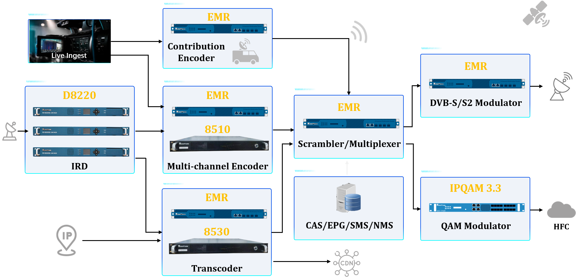 The whole system conforms to the DVB-S/S2, DVB-C, ATSC, ISDB-T/Tb, etc. standards, which enables it to be compatible with all kinds of standard headend equipment. Furthermore, the flexible modular design of EMR 3.0 platform makes our system an extremely future-proof solution.